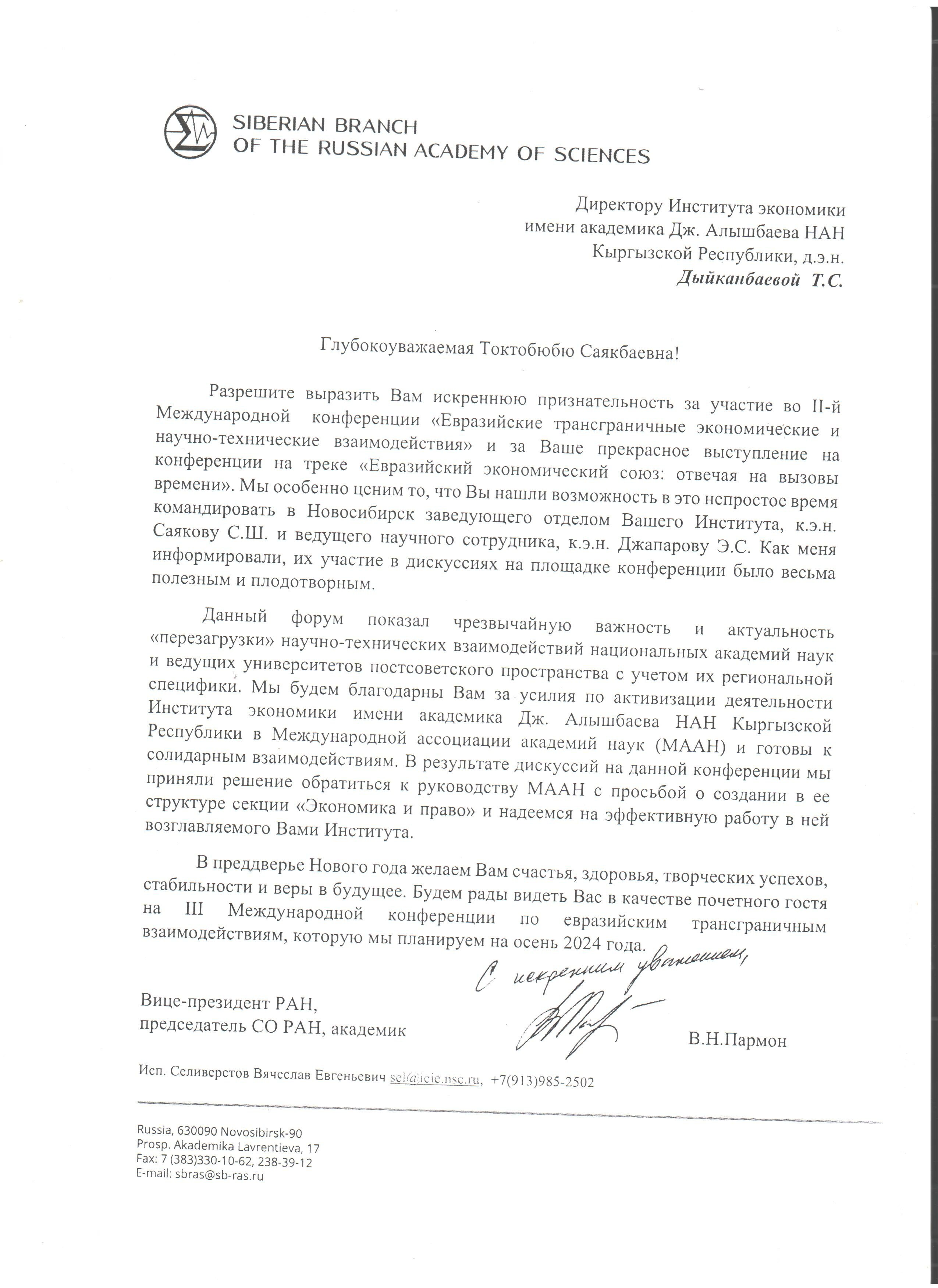 Let me express my sincere gratitude to you for participating in the II International Conference “Eurasian Cross-Border Economic, Scientific and Technical Interactions” and for your excellent speech at the conference on the river “Eurasian Economic Union: Responding to the Challenges of the Time”. We especially appreciate the fact that you found an opportunity at this difficult time to send to Novosibirsk the head of the department of your Institute, Ph.D. Sayakov S.Sh. and leading researcher, Ph.D. Dzhaparov E.S. I was informed that their participation in the discussions at the conference site was very useful and fruitful.